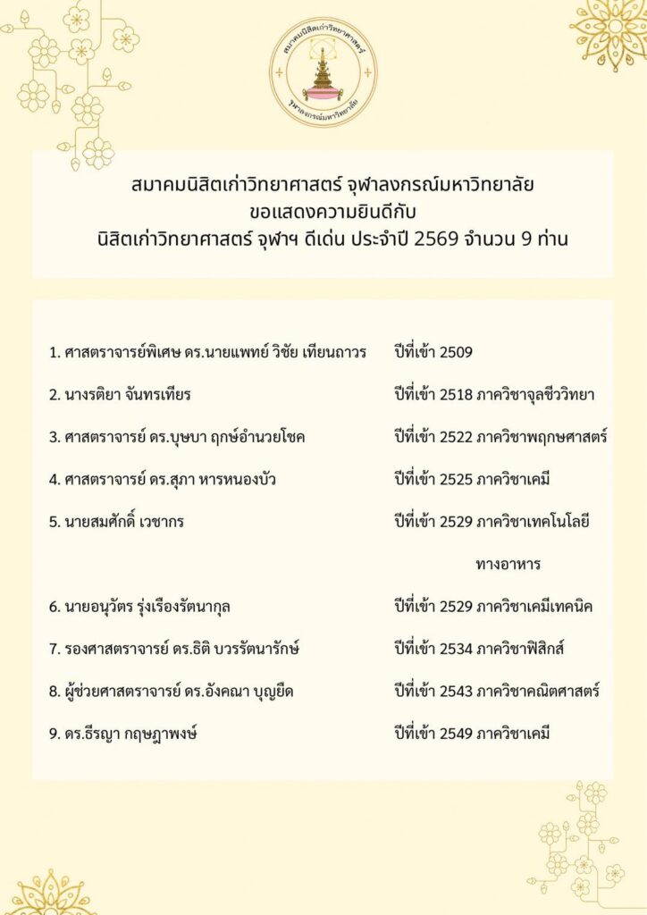 นิสิตเก่าวิกยาศาสตร์ จุฬาฯ ดีเด่น ประจำปี 2569 จำนวน 9 ท่าน